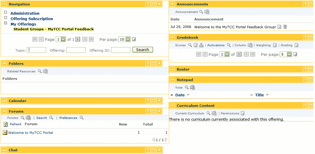 resources include Announcements, Forums, Calendar, Notepad and Folders. A common