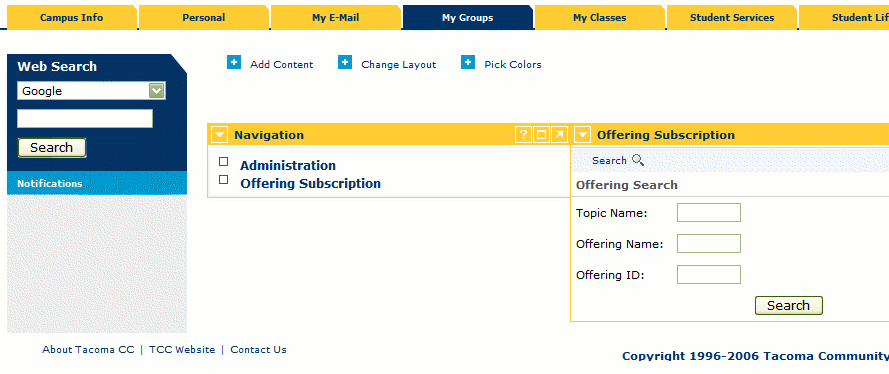 Once you see the list of Offerings (or Groups) that are available you may click the link under Status that says "Unenrolled". Clicking on this link will change the link to "Enrolled" and enroll you in the Group. Now that you have enrolled in at least one group a third link will appear in the "Navigation" channel called "My Subscriptions". Under "My Subscriptions" you should see listed all the groups you are enrolled in. Click one of these groups to get started.